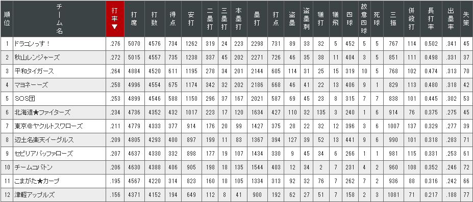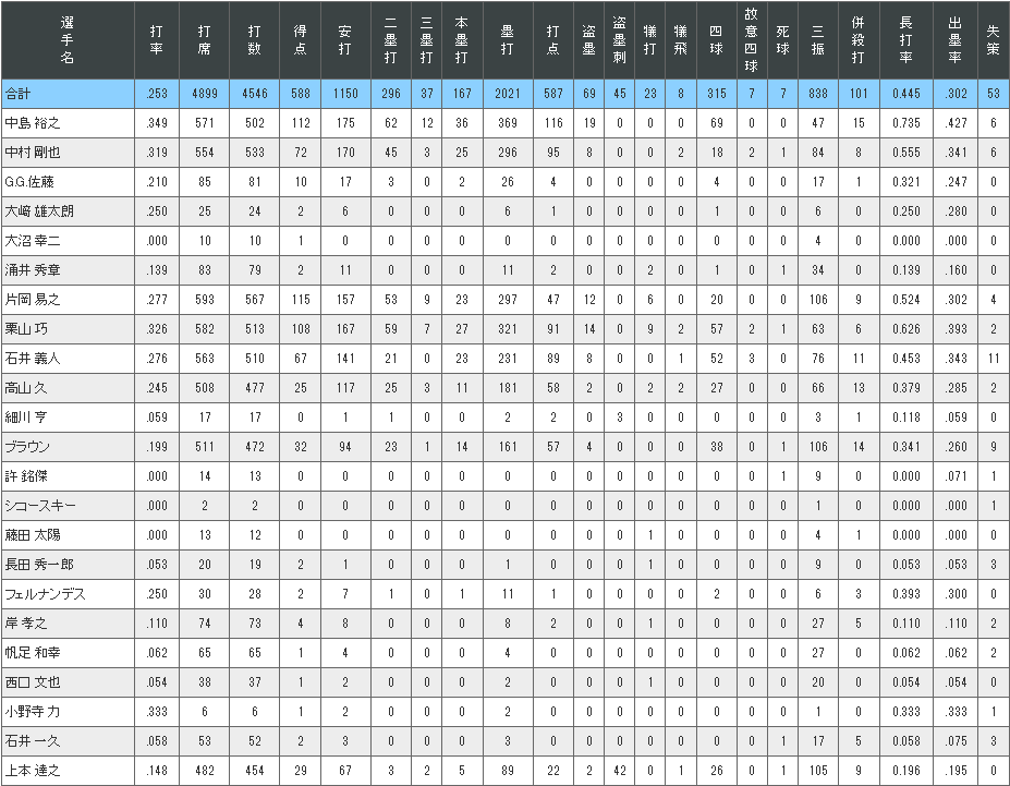 その一方で、なぜか投手の小野寺05が打率.333と好成績でした。たまたまだとは思うけど、この成績はなんと中村01よりもいい。まぁ、小野寺05は6打席であるのに対して、中村01は554打席あったわけだから、簡単には比べられないとは思うけど。とはいえ、打でも期待できる投手は貴重。この活躍が、今回限りでないことを願う。