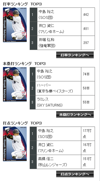 中島は2種類ありますが、.380と好成績な中島は01、なんじゃこりゃな成績の中島は05です。入手した時は、それなりに期待しました。しかし、実際使ってみるとこんなにもひどい成績になってしまったので、05→01に変更しました。一応、栗山05(.038の方)と中島05で「クリーンナップ・コンビ」を発動させたのですが、この結果。前回も同じことを書いた気がしますね。
